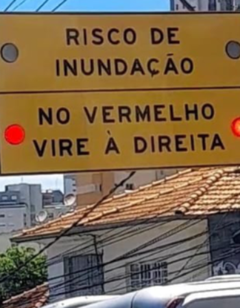 Os dispositivos também oferecem informações, com frase ‘Risco de inundação/ No vermelho, não avance’.